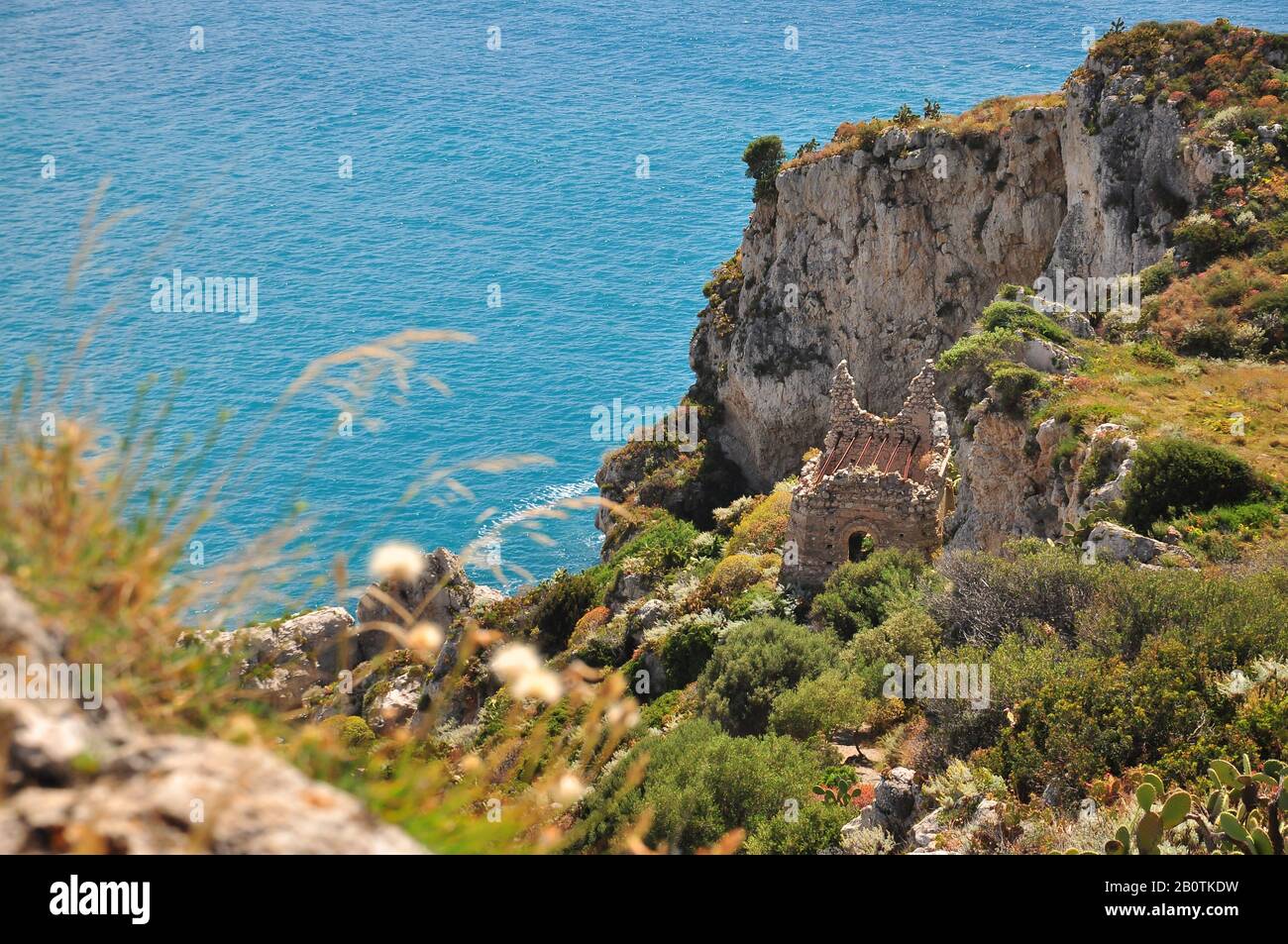 Ruins Of A Tower Among The Vibrant Green And Blue Nature Of Capo Milazzo Milazzo Sicily Italy Stock Photo Alamy