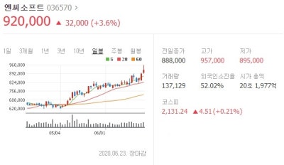 엔씨소프트가 결국 자세를 바짝 낮췄다. 아직도 nc겜하는 애들이 진짜 대가리 터진 애들이라니까. Nc엔씨소프트 3년만에 시총 2배 20조 돌파 0 20200623.